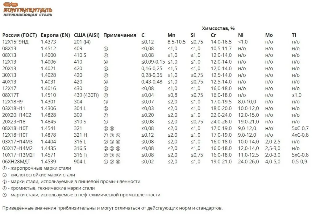 Россия (ГОСТ) Европа (EN) США (AISI) Примечания C, % Mn, % Si, % Cr, % Ni, % Mo, % Ti, %
